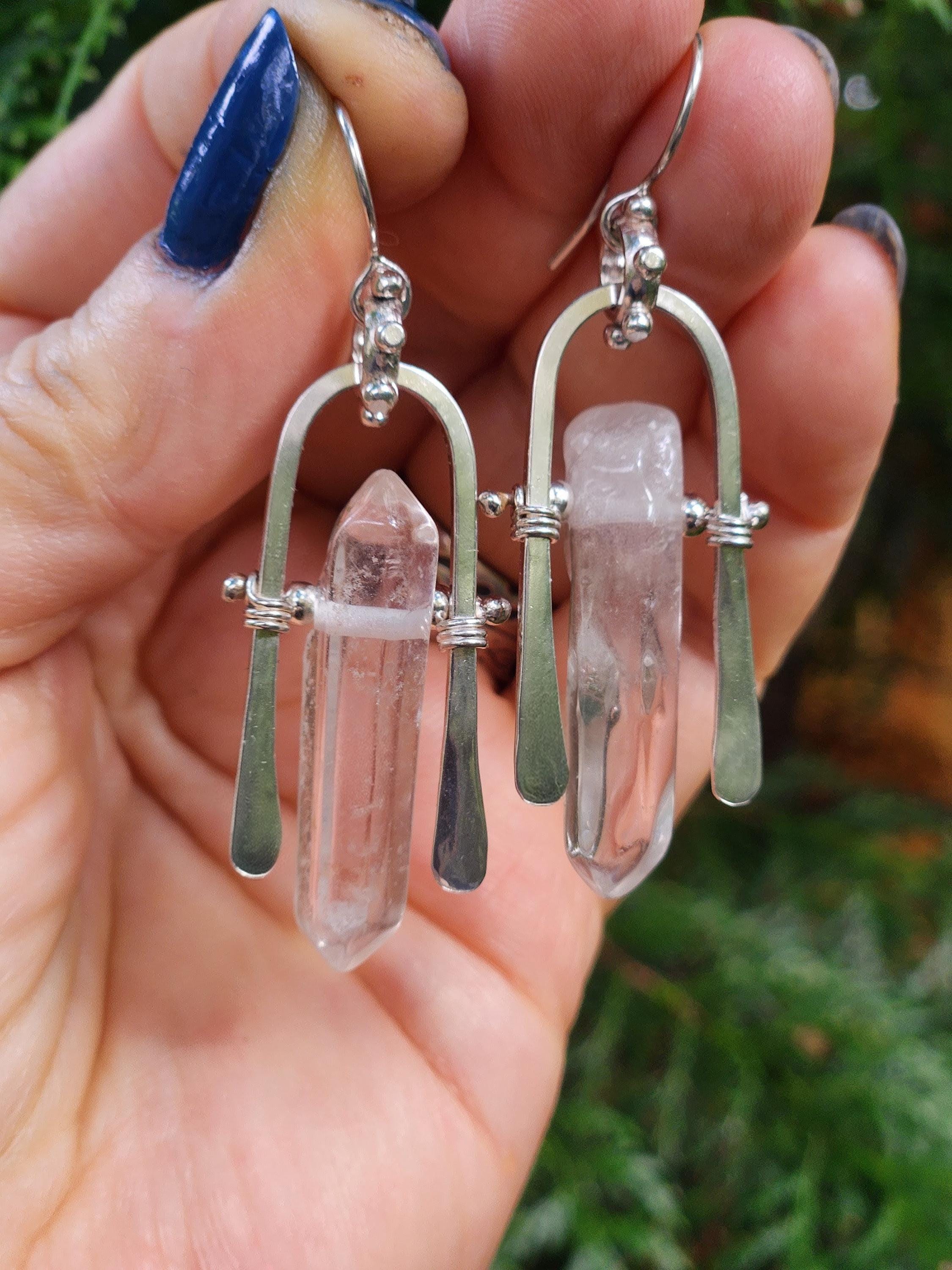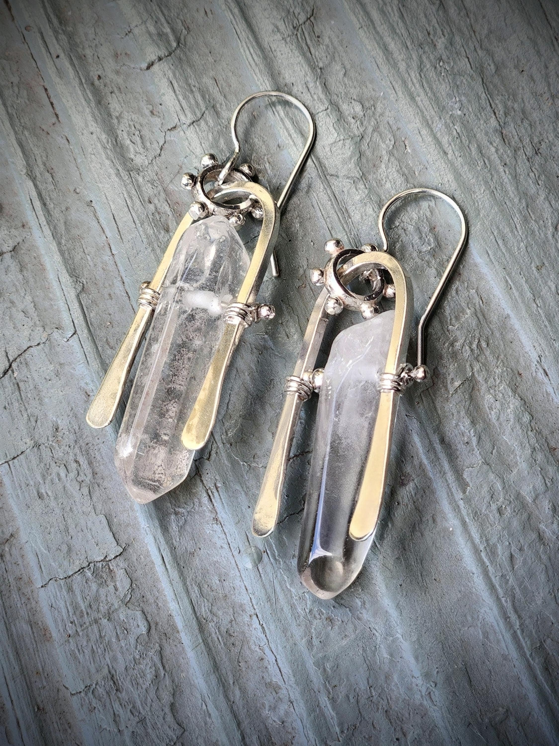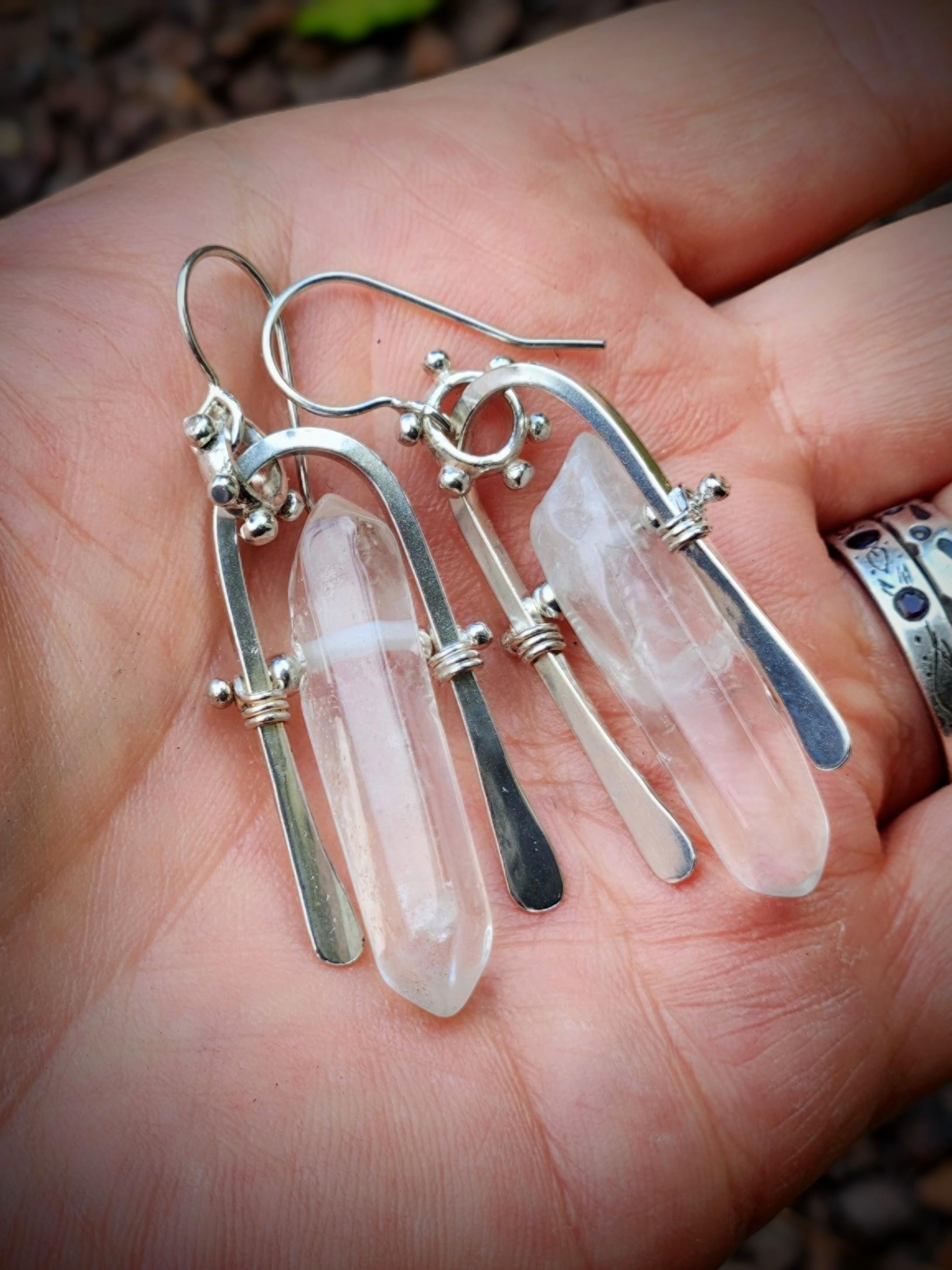 Raw quartz crystal point earrings are entirely hand fabricated of sterling silver. The natural crystals swing freely under hand forged arches with paddle ends and studded rings at the top.