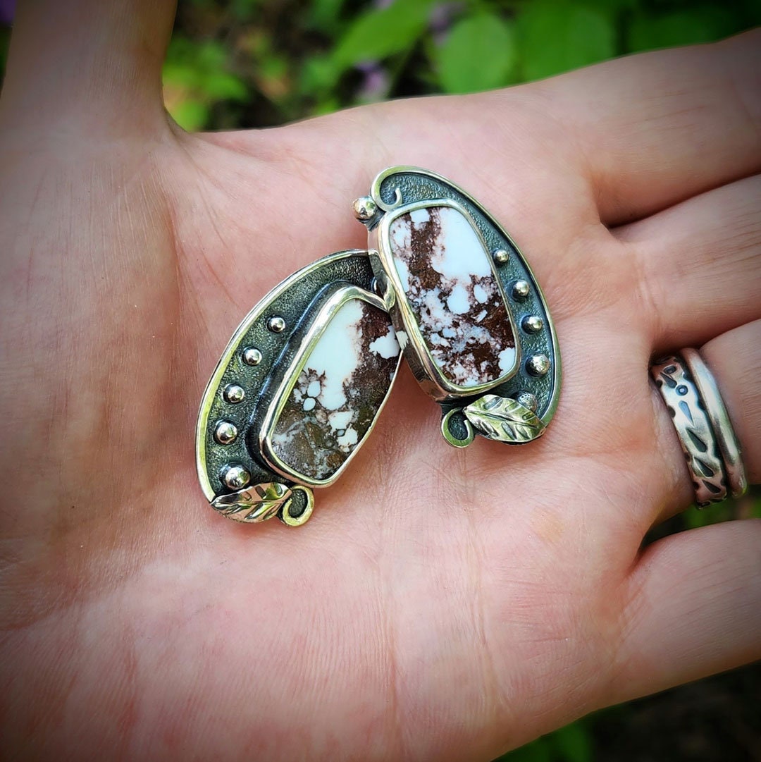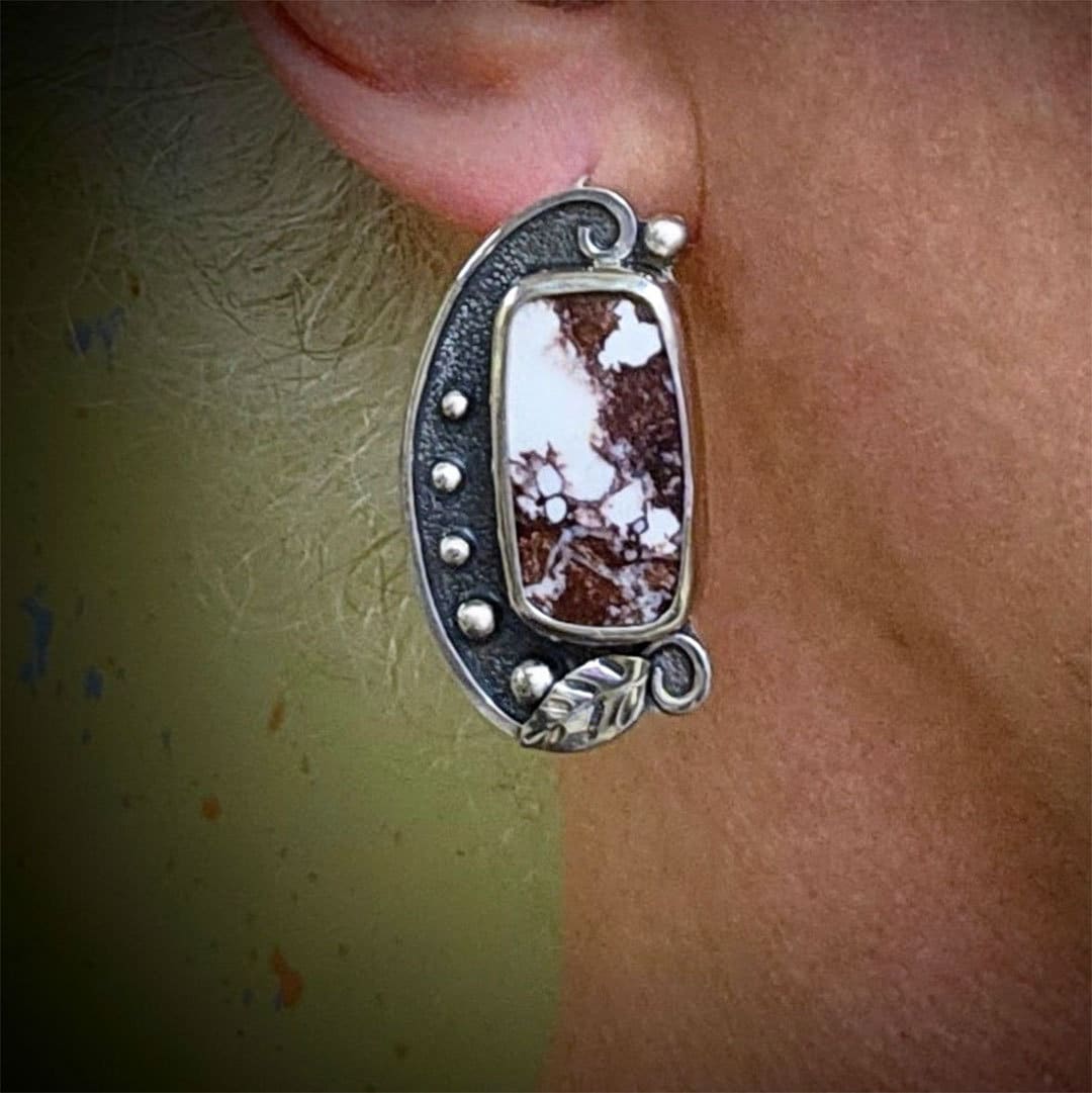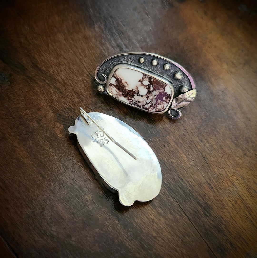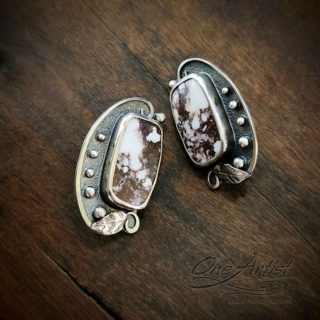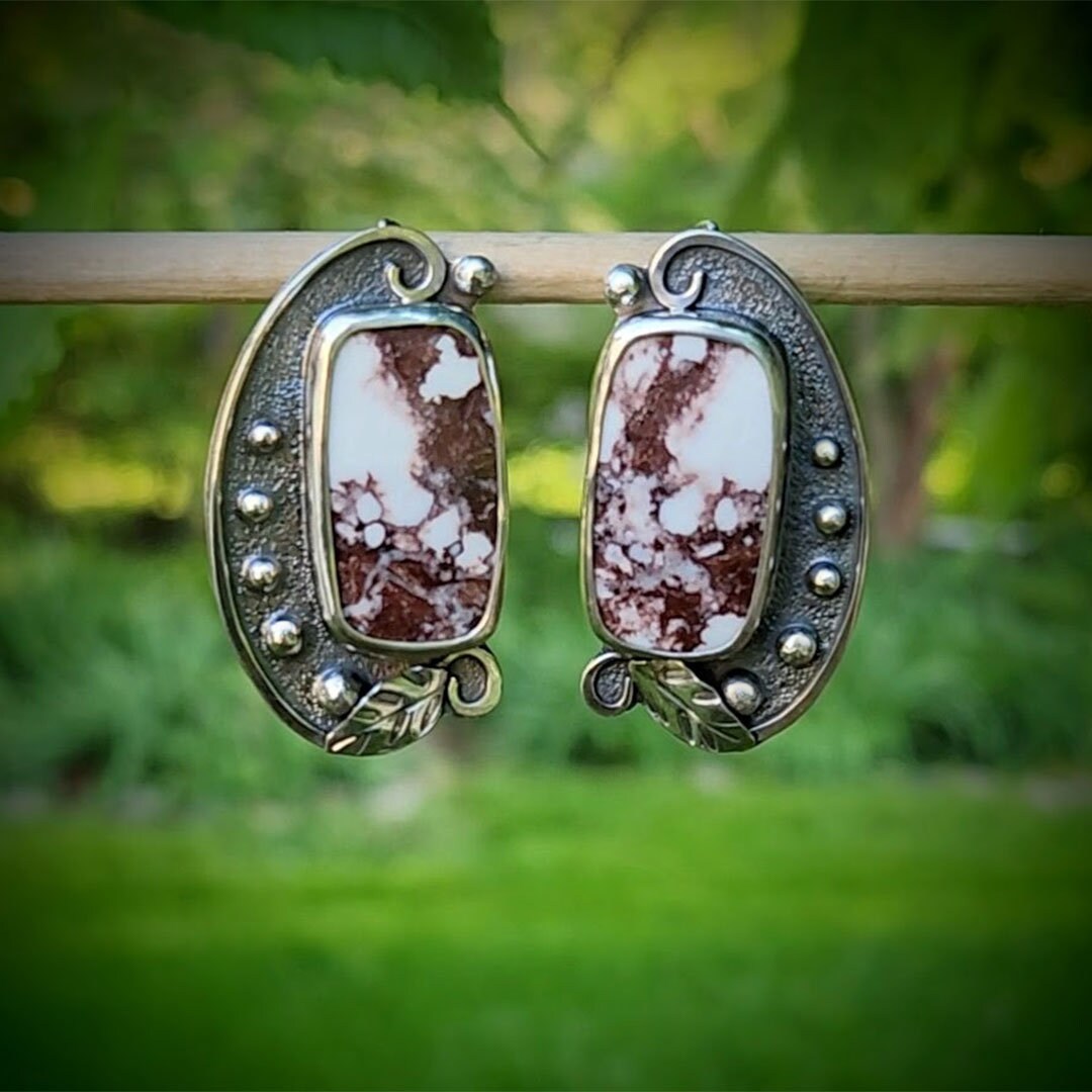 Wild horse jasper, set in my original sterling silver design, with hand forged swirls, granules and leaf embellishments.