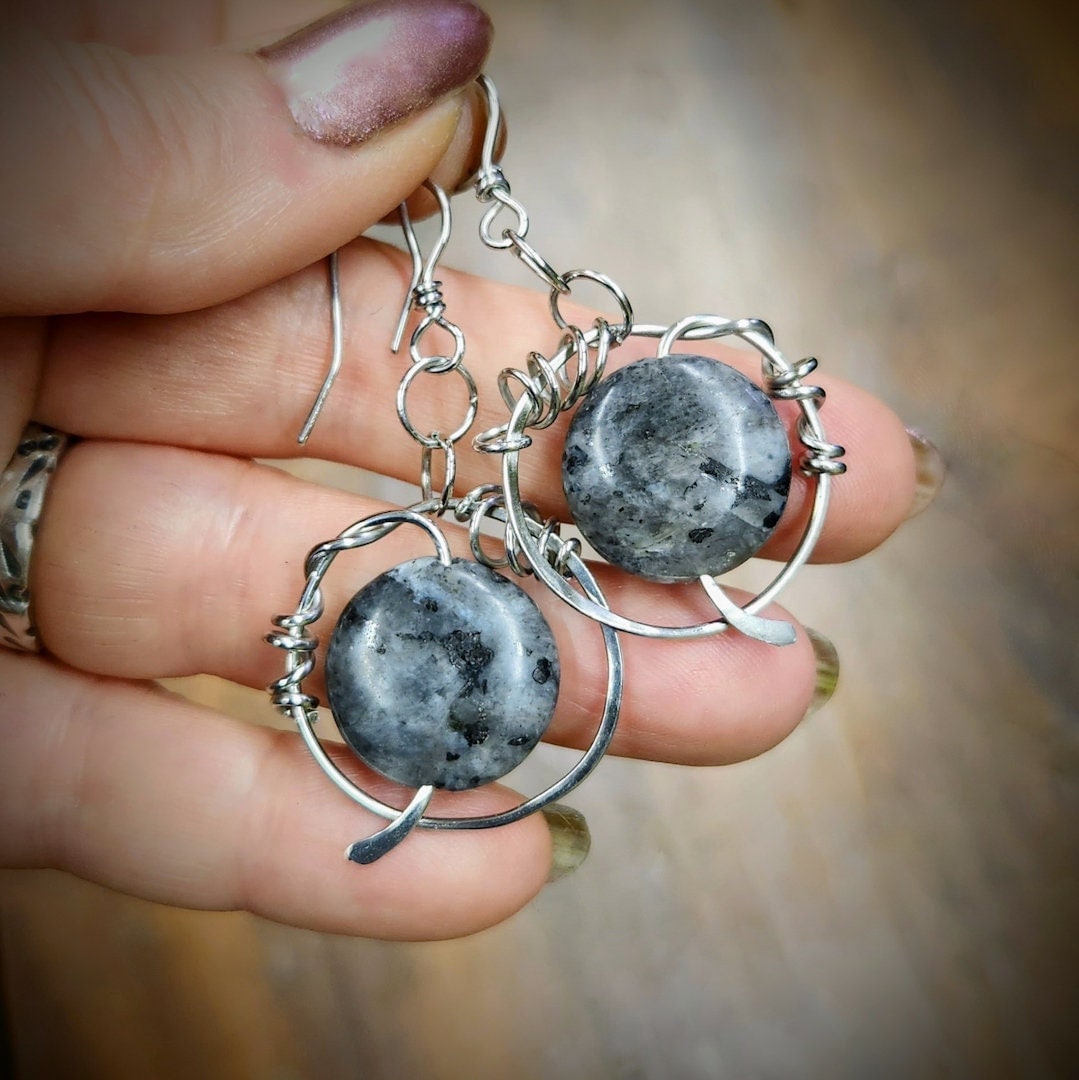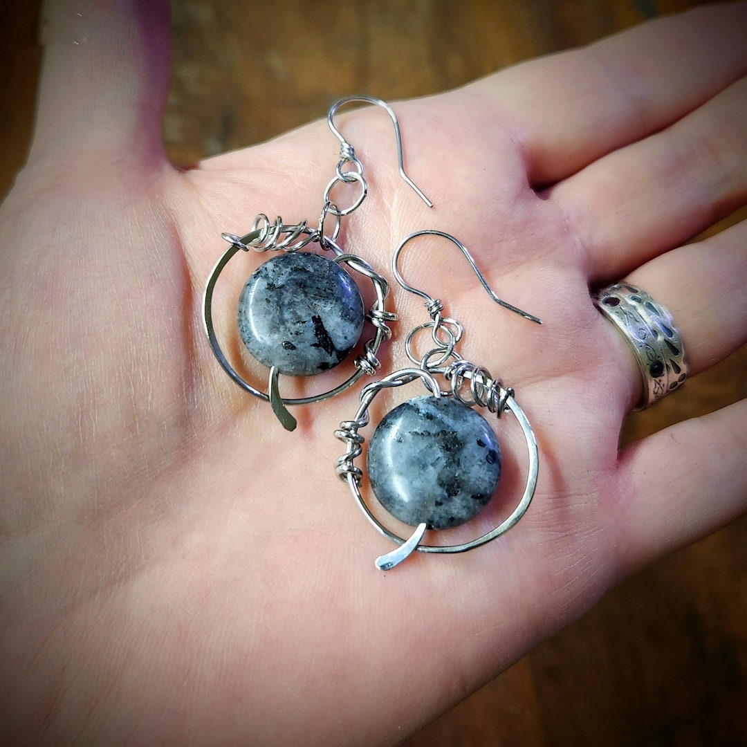 Gorgeous larvikite discs which have a little bit of chatoyant glisten as they move. To enhance them, I've created modern, free form, front facing hoops of hand forged jewelry grade stainless steel, which will hold it's high polished finish. These earrings are hypoallergenic, which makes them the perfect choice for anyone who might get a reaction to other metals.
