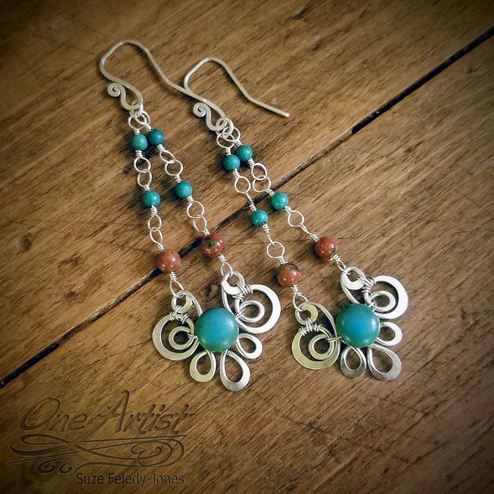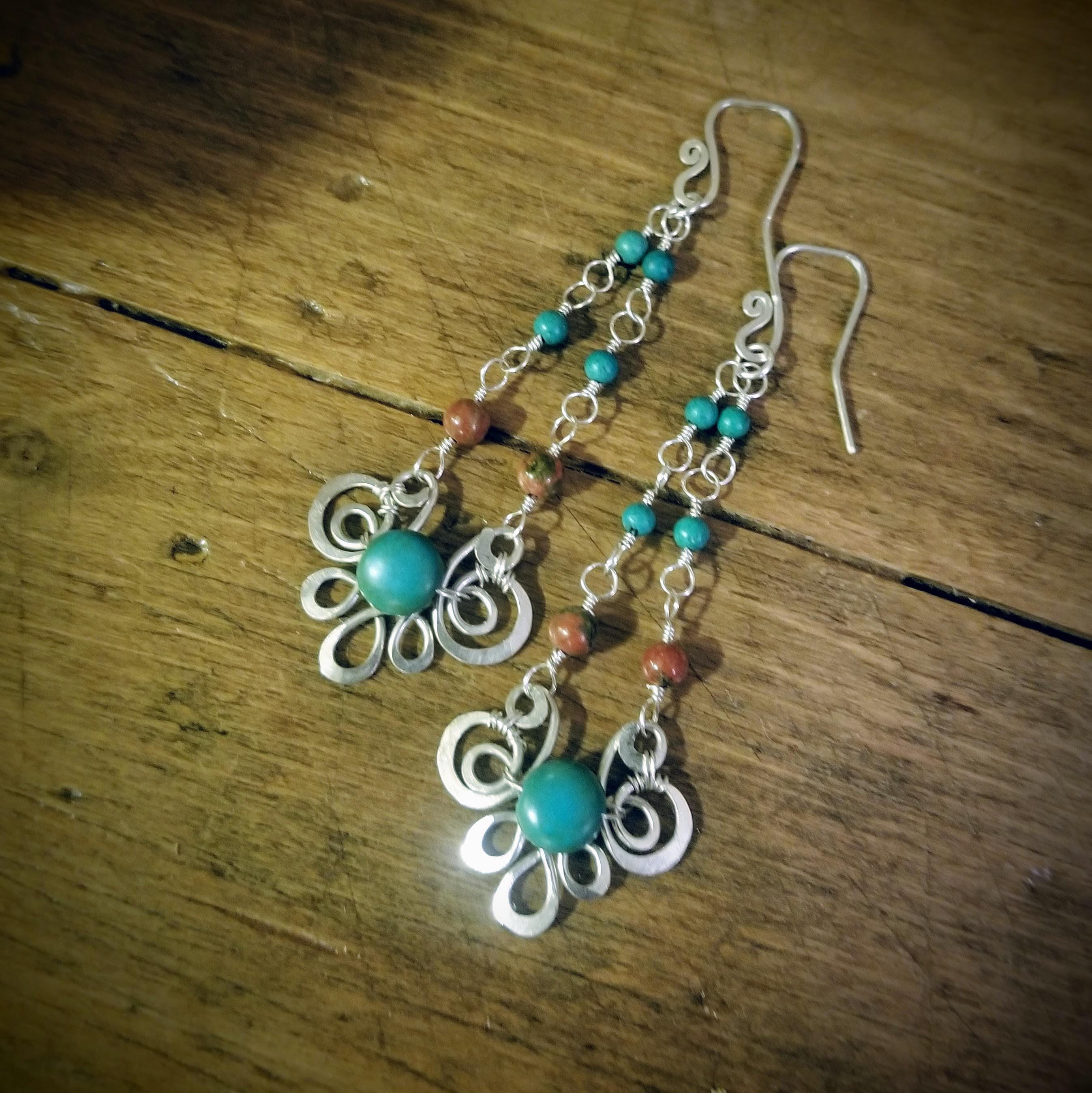 Fun Boho swing style earrings with turquoise and unakite gemstone beads. Entirely hand forged and fabricated of jewelry grade stainless steel. These are made in an art nouveau style, are very lightweight, will not tarnish and have the bonus of being hypoallergenic.